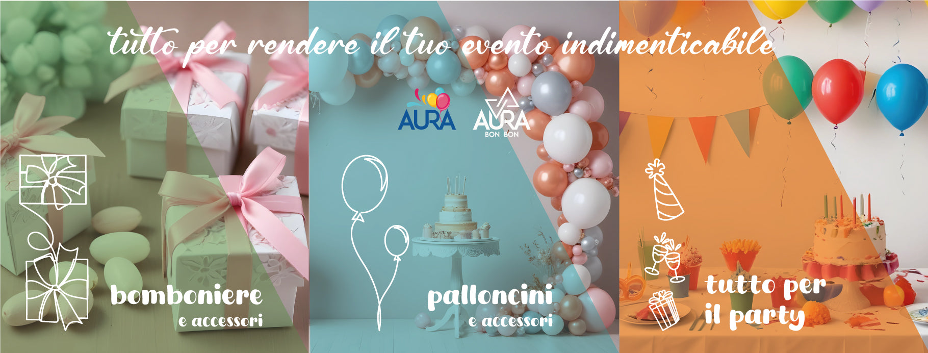 Aura è il tuo punto di riferimento per bomboniere uniche e articoli per feste indimenticabili. Offriamo un'ampia selezione di prodotti per matrimoni, battesimi, comunioni, compleanni e ogni altra occasione speciale. Con Aura, qualità e convenienza si incontrano: scegli tra decorazioni, accessori e dettagli personalizzabili per rendere i tuoi eventi davvero speciali. Visita il nostro shop online o il nostro punto vendita per scoprire tutte le novità!