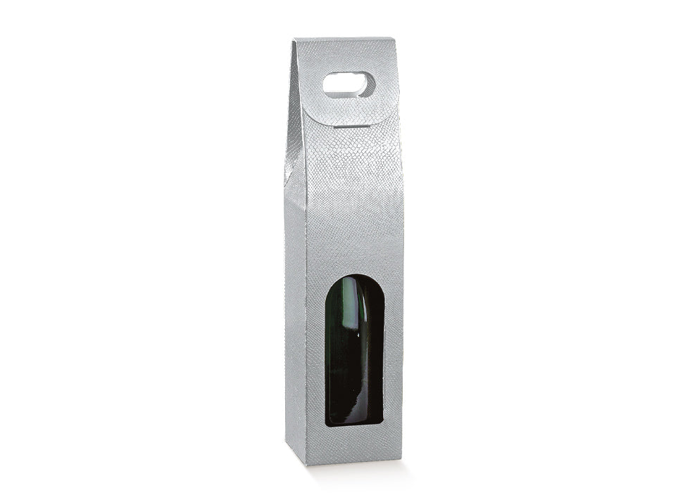 Scatola per 1 bottiglia 90x90x385 mm con finitura skin argento, elegante e raffinata, ideale per confezioni regalo di vini.