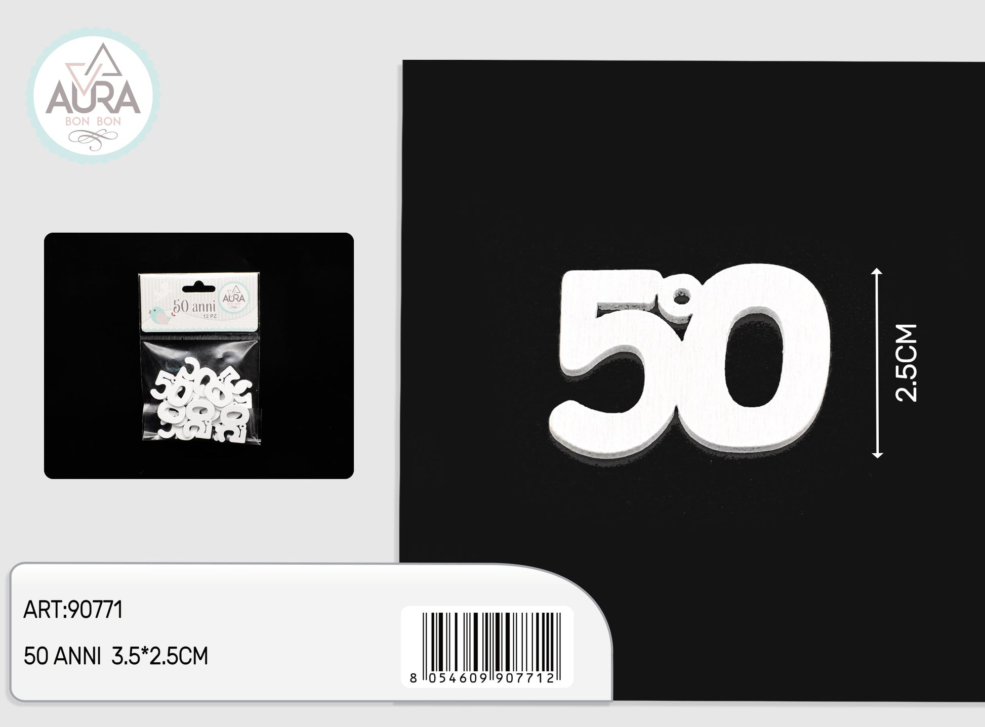 Confezione da 12 tag in legno bianchi con numero "50", perfetti per decorazioni eleganti di anniversari e compleanni.