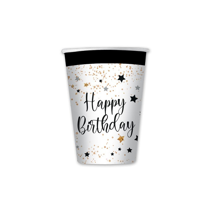 Set da 8 bicchieri da 200 cc con scritta "Happy Birthday", ideali per feste di compleanno allegre e colorate.