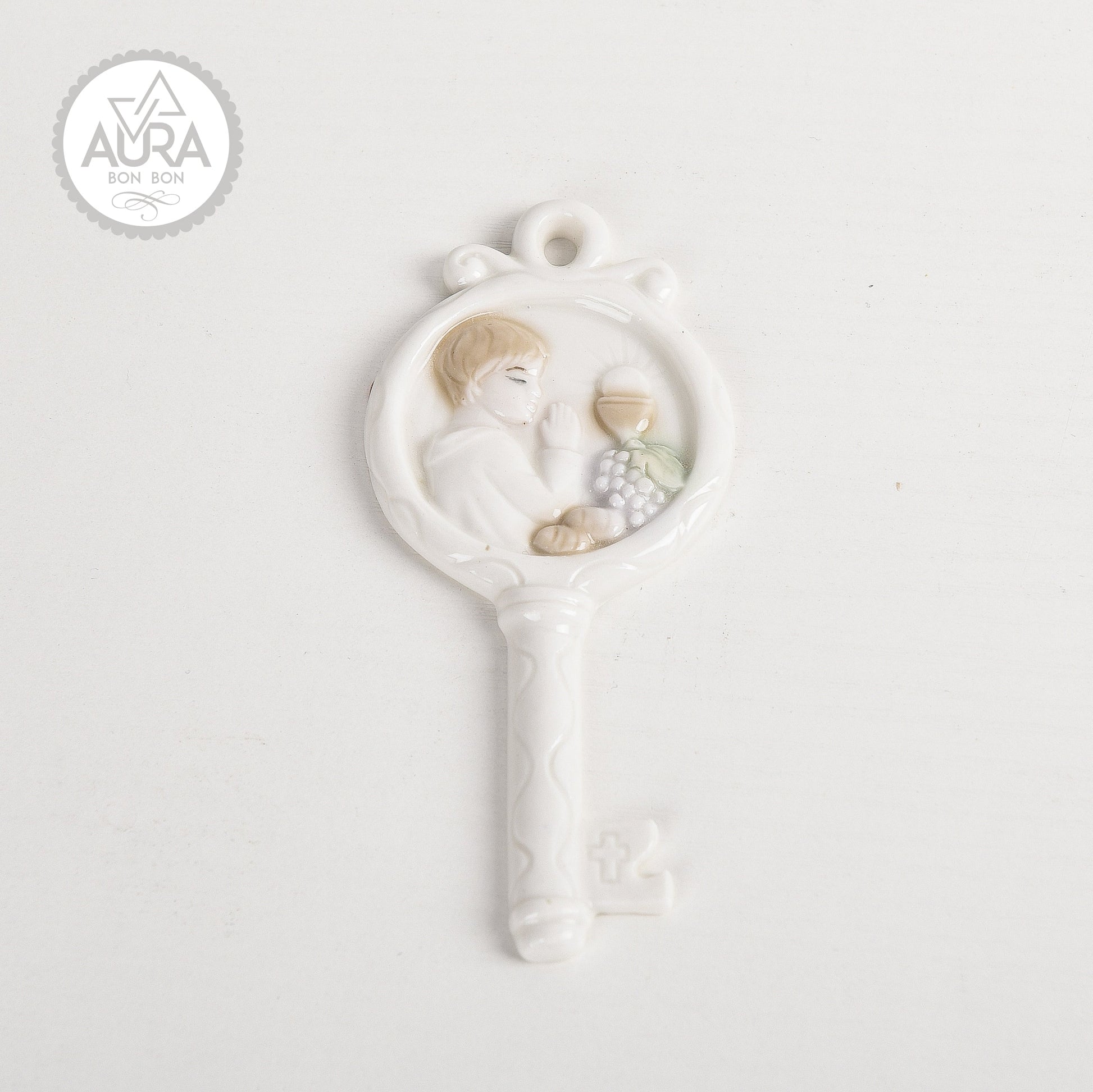 Bomboniera in porcellana a forma di chiave con dolce bimbo stilizzato, perfetta per celebrare la Prima Comunione. Un’idea raffinata e simbolica per rendere speciale ogni dettaglio.