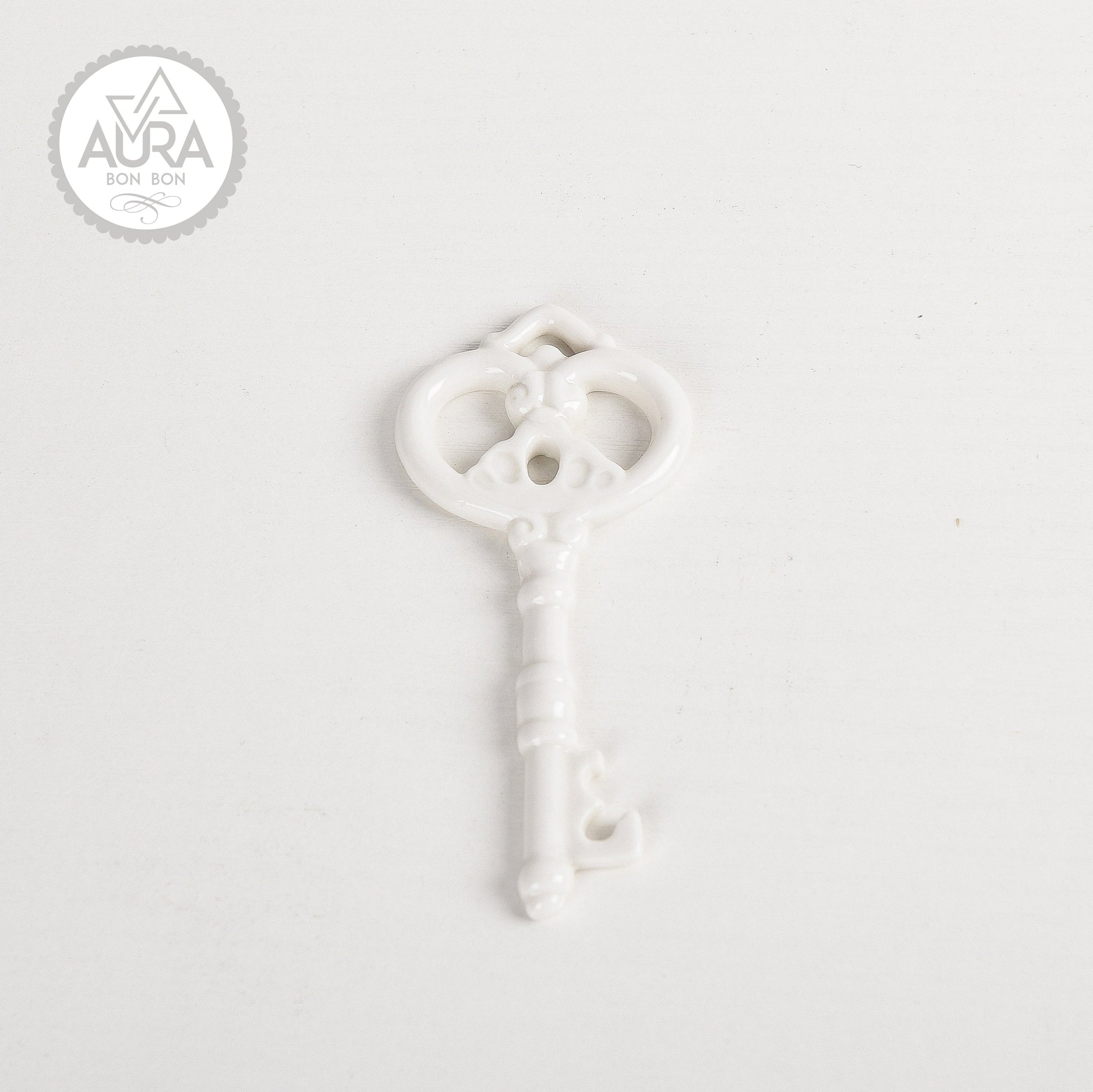 Chiave decorativa in porcellana bianca lucida, dallo stile romantico e raffinato. Un simbolo di buon auspicio, perfetta per bomboniere, segnaposto o idee regalo uniche.
