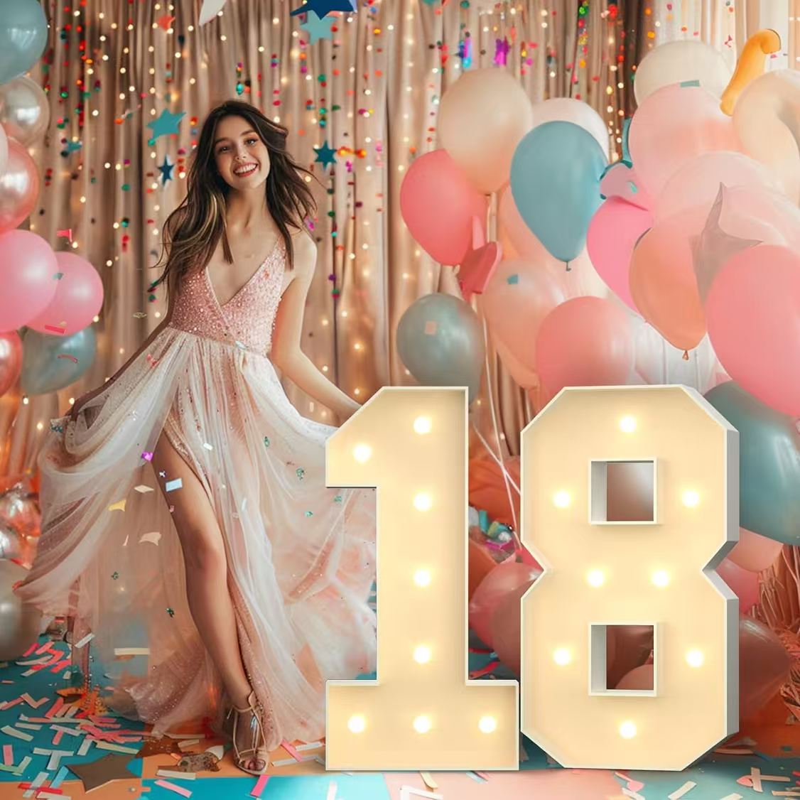 Numero 8 luminoso in cartone con luce calda. Due modalità: fissa e intermittente. Perfetto per decorare feste, compleanni e allestimenti speciali. Richiede 2 batterie AA.