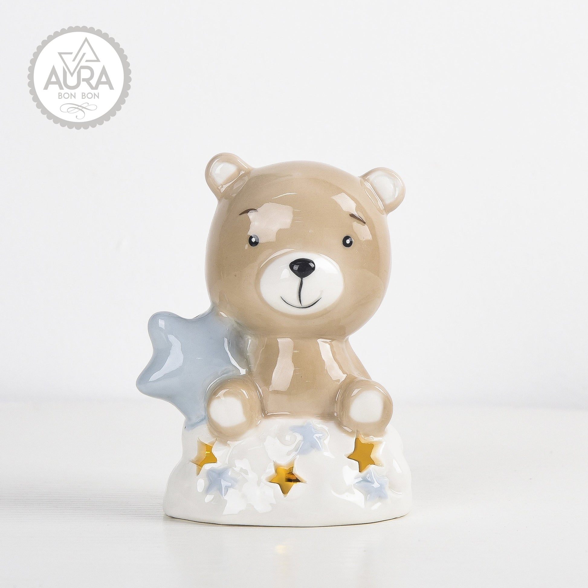 Dolcissimo orsetto in ceramica smaltata, seduto su una nuvola con stelline traforate e decorato con una stella azzurra tra le zampine. Ideale come bomboniera per nascita o battesimo, può essere anche utilizzato come luce notturna se illuminato dall’interno. Un tenero pensiero che trasmette amore e serenità.