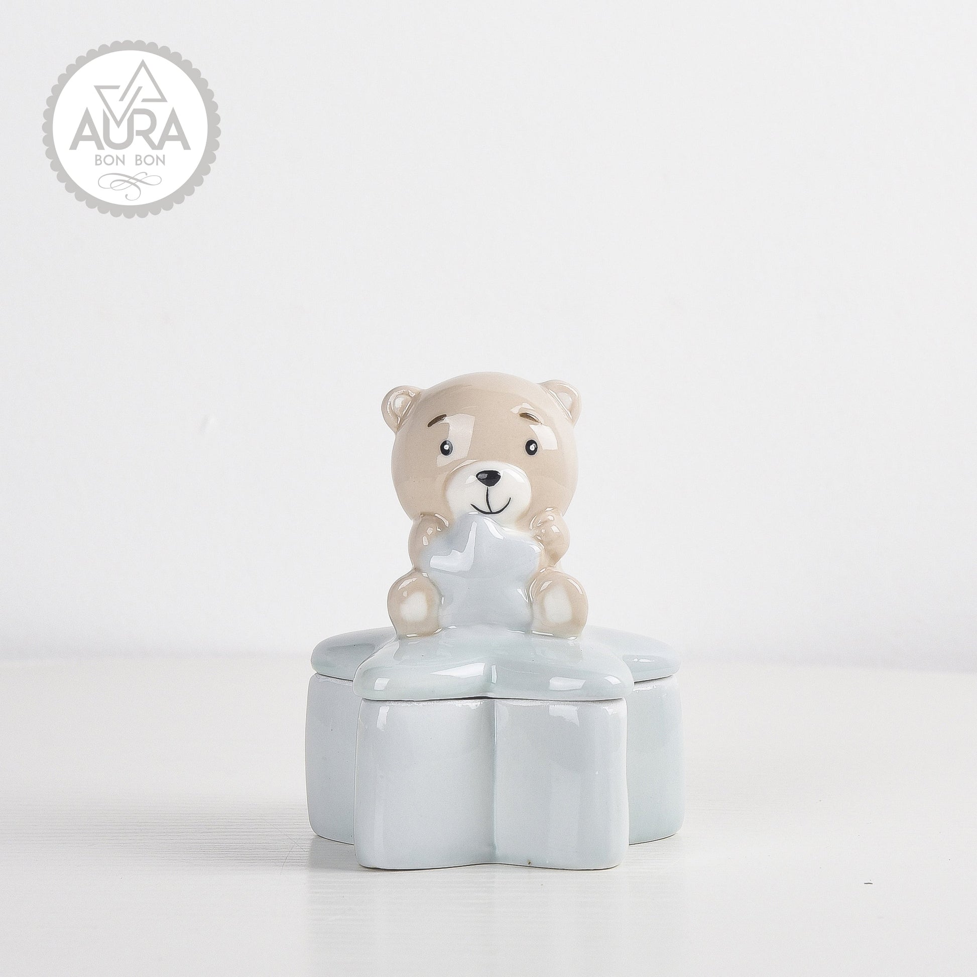 Elegante portagioie a forma di stella azzurra in ceramica, con un tenero orsetto seduto sul coperchio. Perfetta come bomboniera per nascita o battesimo, un ricordo prezioso che unisce dolcezza e funzionalità.