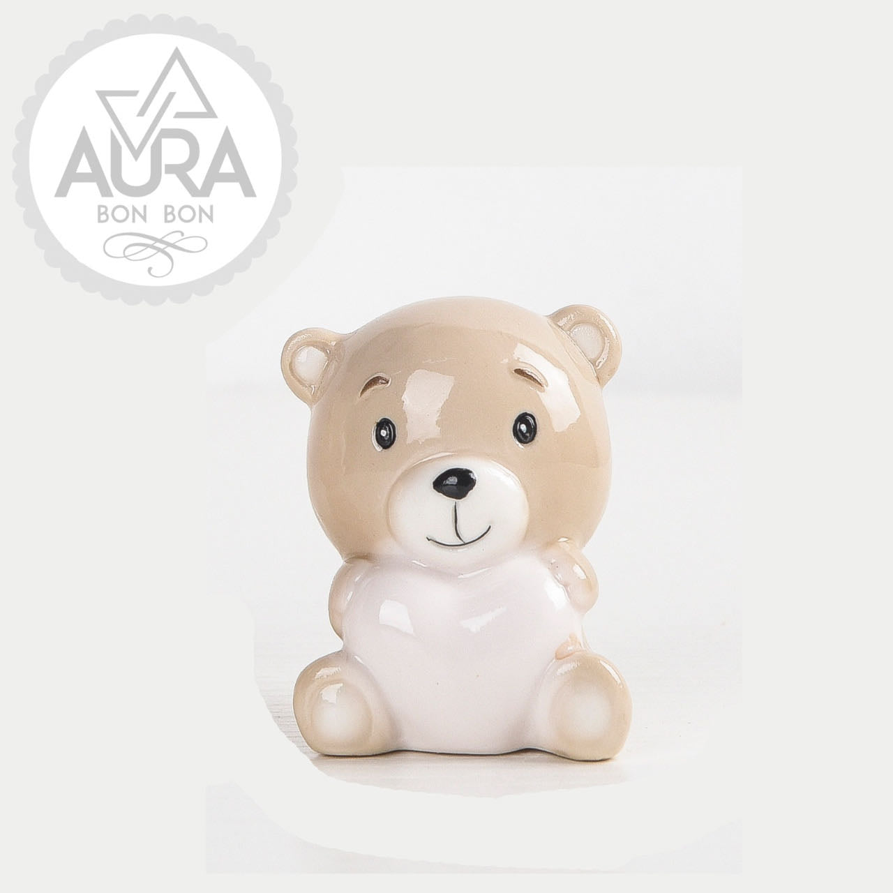 Piccolo orsetto in ceramica smaltata, raffigurato mentre abbraccia teneramente un cuore rosa. Un oggetto dolce e simbolico, perfetto come bomboniera per nascita, battesimo o primo compleanno di una bambina. Le sue dimensioni compatte lo rendono ideale anche come segnaposto o decorazione da tenere come ricordo prezioso.