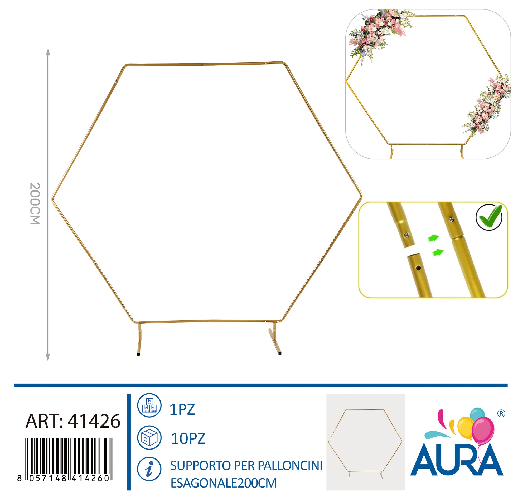 Supporto per palloncini esagonale 200cm oro