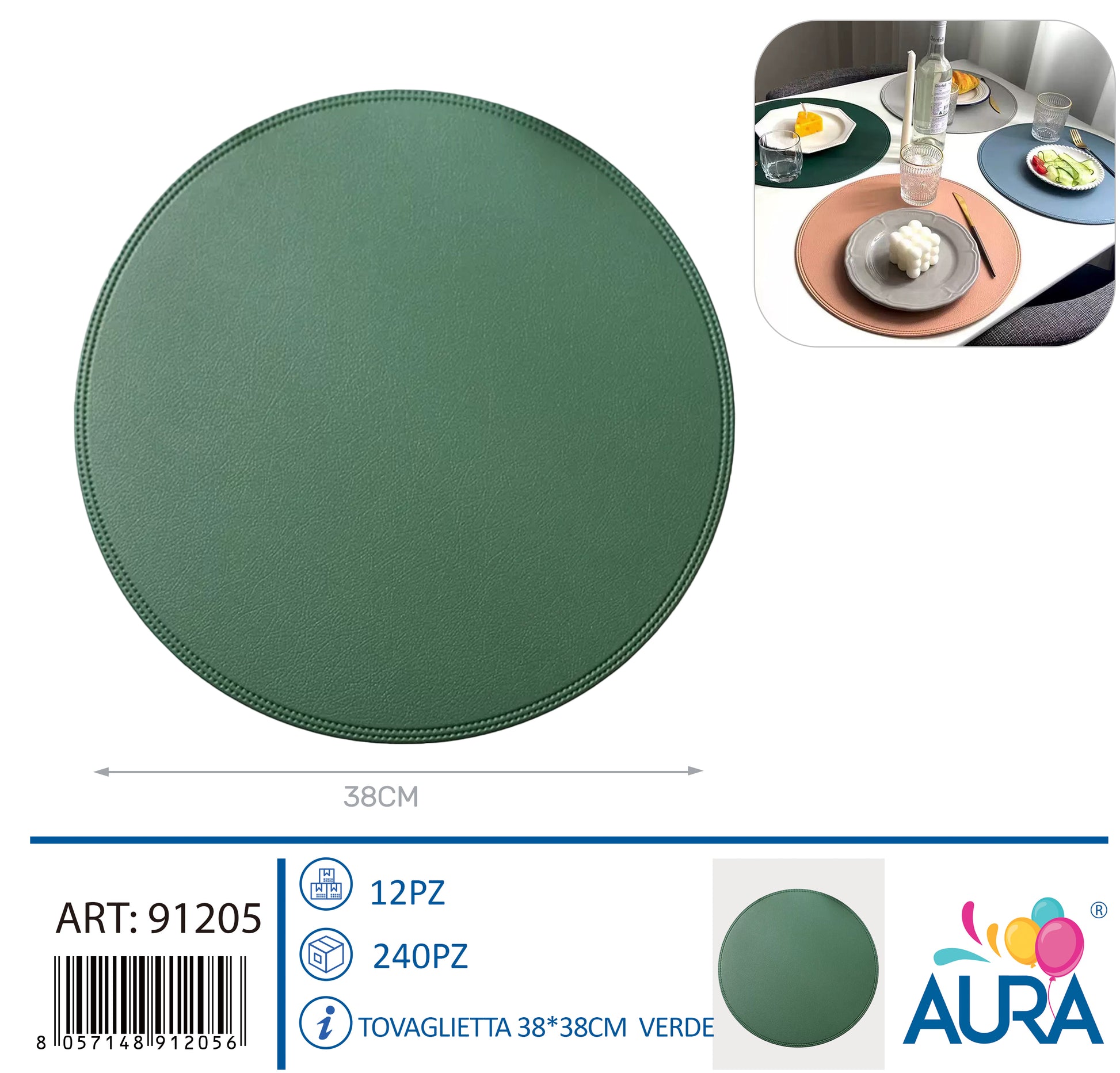 Tovaglietta tonda 38x38cm in verde, ideale per hotellerie, ristoranti e organizzatori di eventi. Elegante e pratica, perfetta per valorizzare la presentazione tavola.