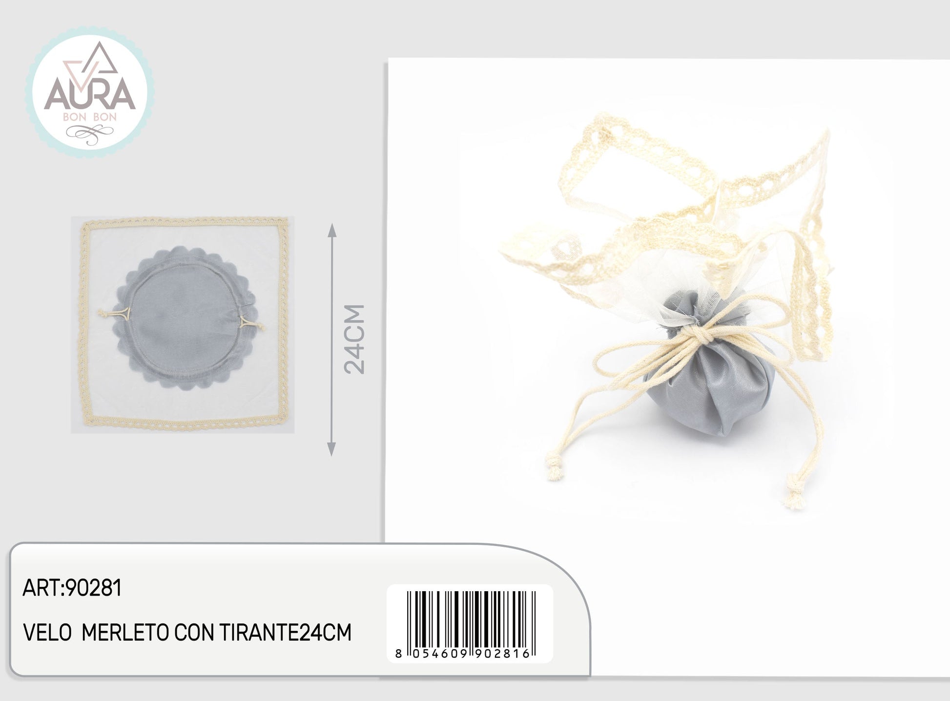 Questo raffinato velo portaconfetti è l'ideale per cerimonie eleganti e ricorrenze speciali. Presenta un merletto color avorio che dona un tocco di delicatezza, abbinato a un tessuto interno grigio sofisticato. Il pratico tirante permette di chiuderlo facilmente, trasformandolo in un grazioso sacchetto. Con un diametro di 24 cm, è perfetto per contenere confetti o piccoli doni, aggiungendo un tocco di classe a ogni evento.